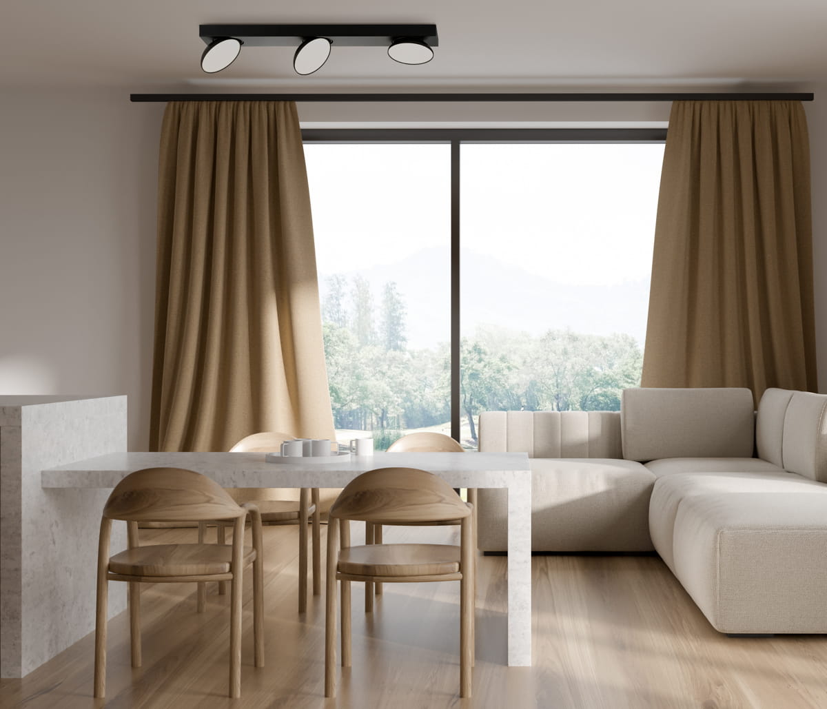 Nowoczesna lampa sufitowa tworzy atmosferę spokojnej, eleganckiej przestrzeni — idealna do salonu, jadalni lub biura. Jej minimalistyczny design i neutralne oświetlenie doskonale wpisują się w wnętrza o stylu skandynawskim lub industrialnym, podkreślając funkcjonalność i prostotę form.