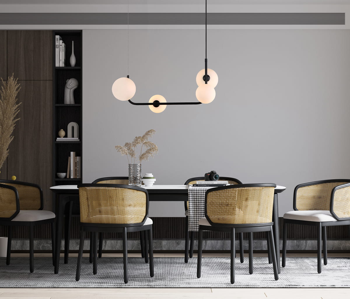 Nowoczesna lampa wisząca z minimalistycznym designem wprowadza do wnętrza delikatny, ciepły klimat, idealnie pasując do salonów, jadalni czy nowoczesnych jadalni. Jej elegancka forma z połączeniem czarnego metalu i białych, szklanych kloszy tworzy subtelną harmonię, która dodaje przestrzeni nowoczesnego charakteru. Idealna do wnętrz o nowoczesnym stylu, gdzie minimalizm spotyka się z ciepłym, przytulnym oświetleniem.
