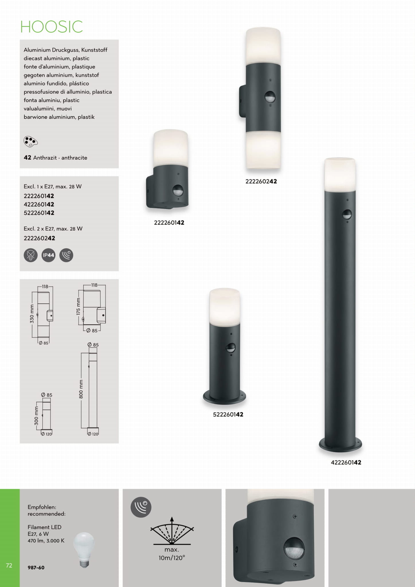 HOOSIC 222260142 kinkiet elewacyjny jednostronny z czujnikiem ruchu antracyt klosz mleczny 1xE27 IP44