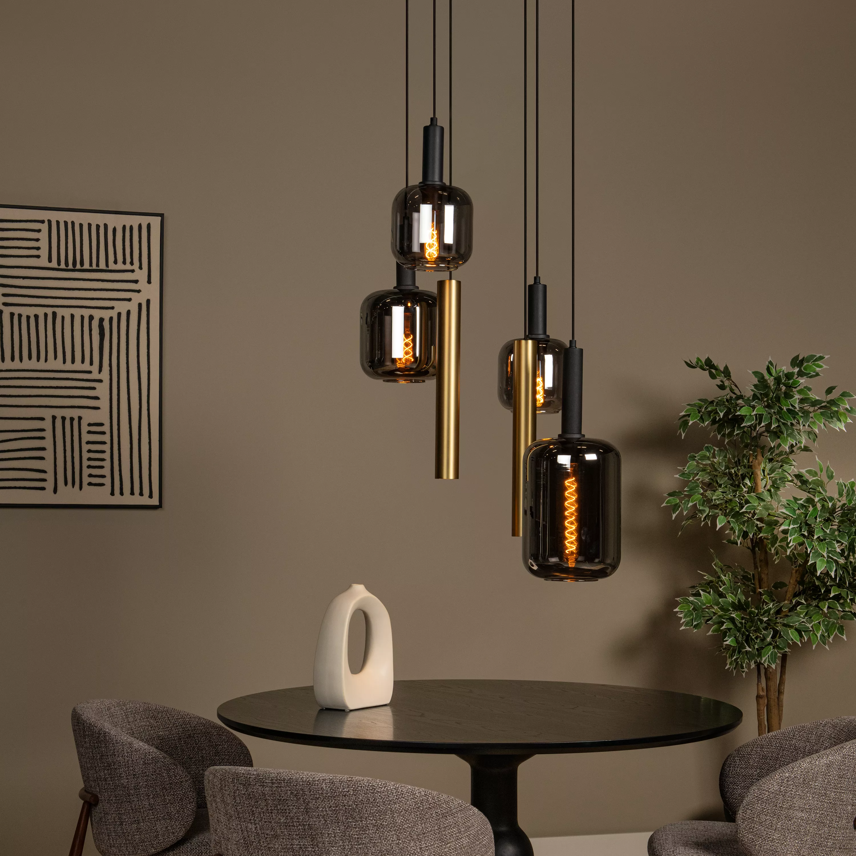 JOANET 45494/16/96 lampa wisząca czarna 4xE27 2xGU10 złote tuby i klosze szklane dymione fi 16/21/22cm różne klosze