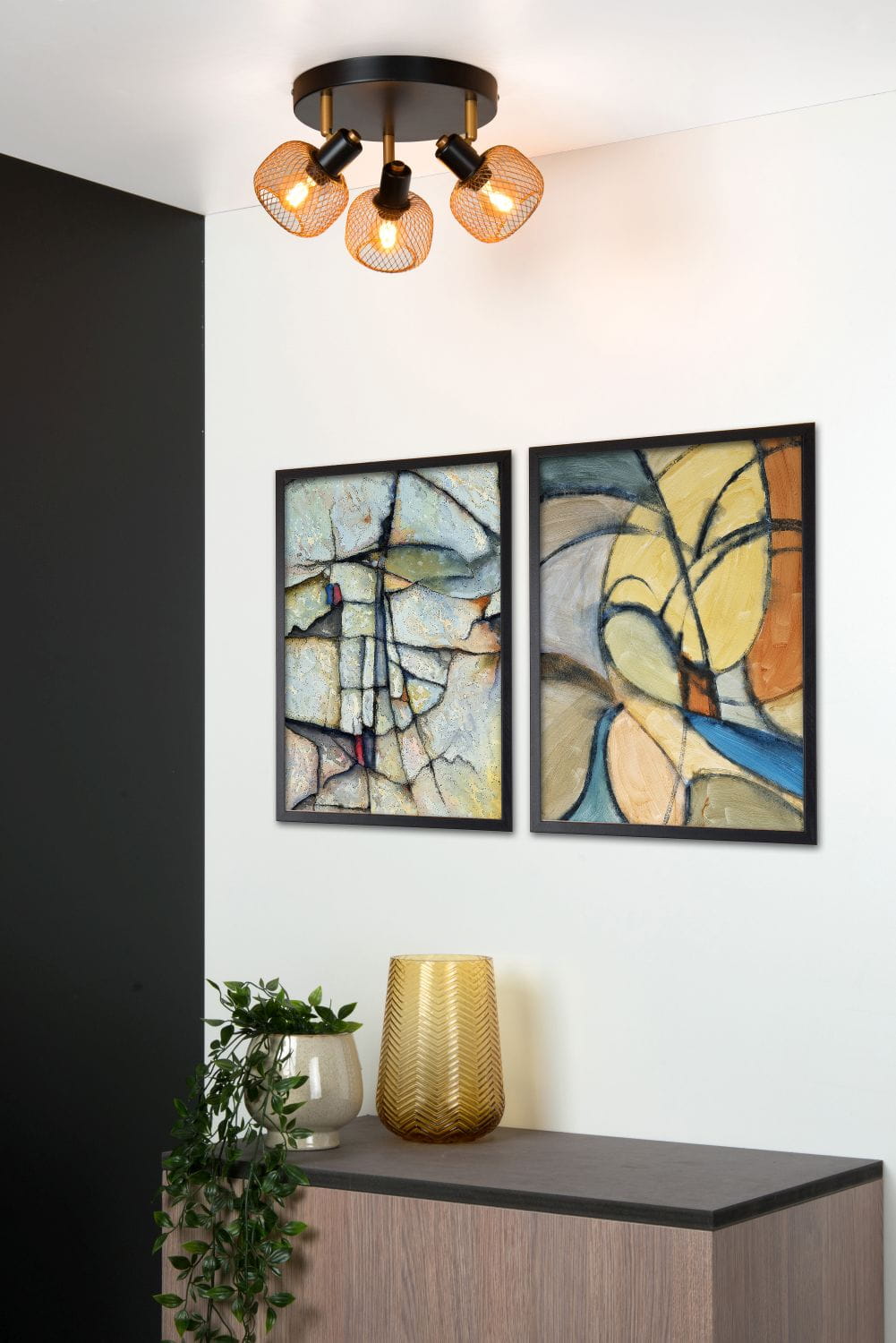 Wyjątkowe połączenie czarnego korpusu i złotych kloszy z metalowej siatki nadaje lampie niepowtarzalny charakter, który doskonale wpisuje się w aktualne trendy wnętrzarskie.