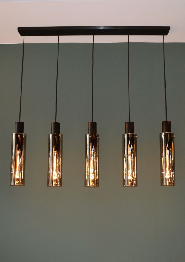 Ta designerska lampa wisząca to doskonały wybór dla osób poszukujących nowoczesnego i minimalistycznego oświetlenia do salonu, jadalni lub kuchni. Pięć cylindrycznych kloszy ze szkła w kolorze dymionego grafitu nadaje wnętrzu elegancji i przytulnego charakteru.